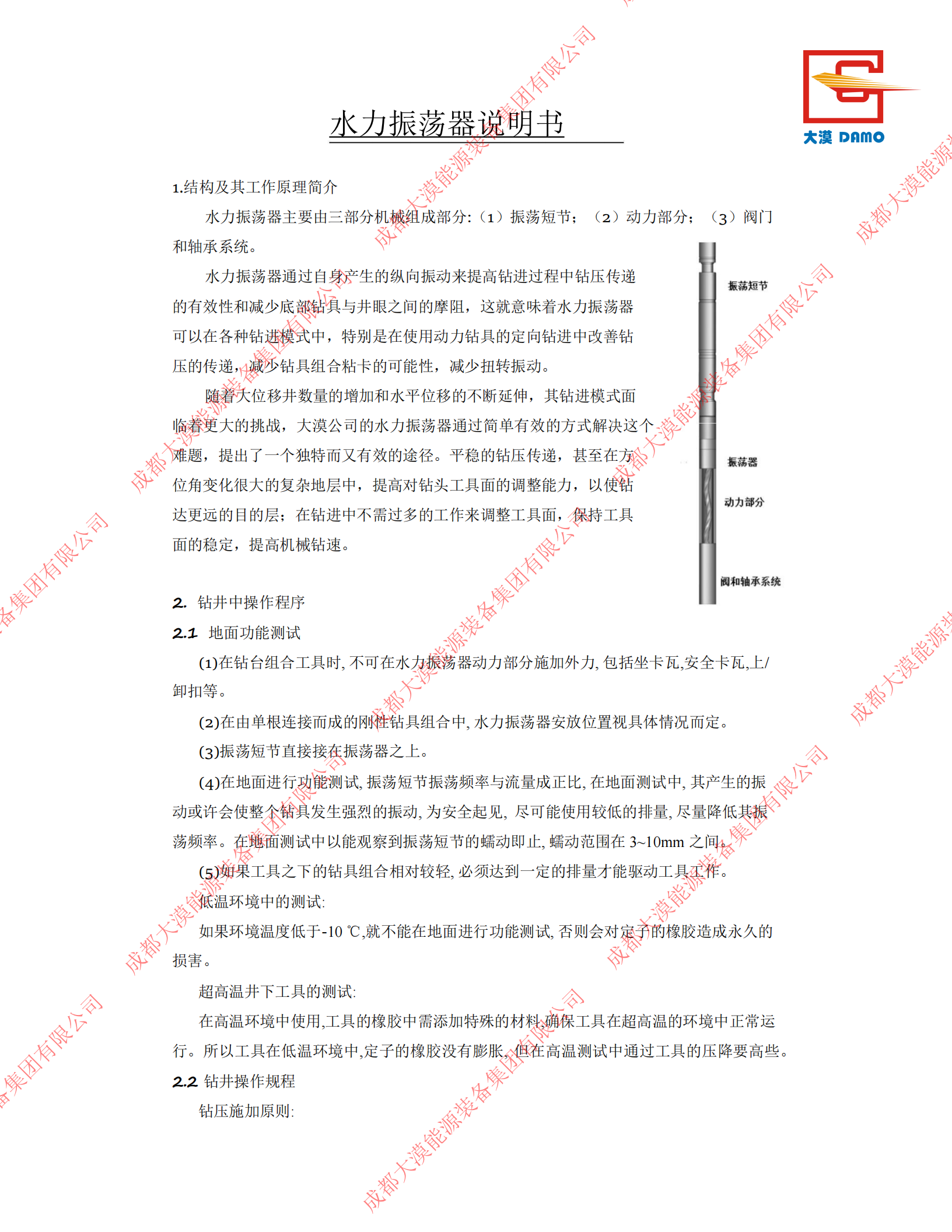 水力振荡器通过自身产生的纵向振动来提高钻进过程中钻压传递的有效性和减少底部钻具与井眼之间的摩阻,这就意味着水力振荡器可以在各种钻进模式中,特别是在使用动力钻具的定向钻进中改善钻压的传递,减少钻具组合粘卡的可能性,减少扭转振动。